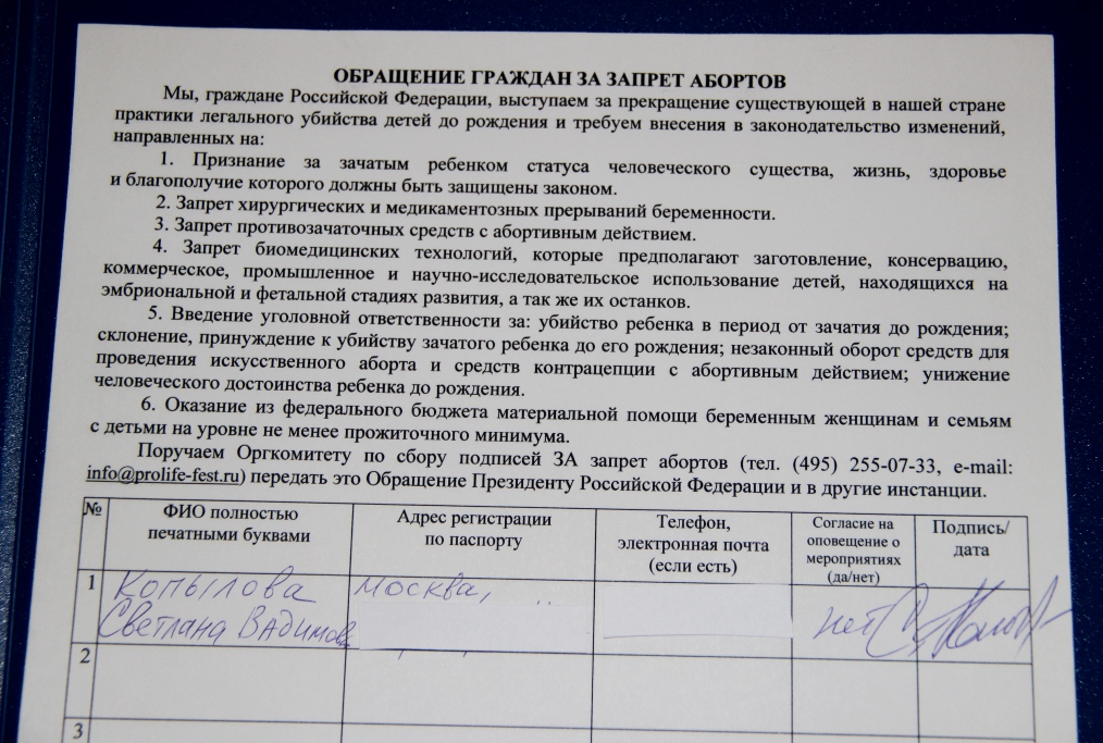 После концерта Светлана Копылова ознакомилась с моделями внутриутробных детей и поставила свою подпись за запрет абортов в России.